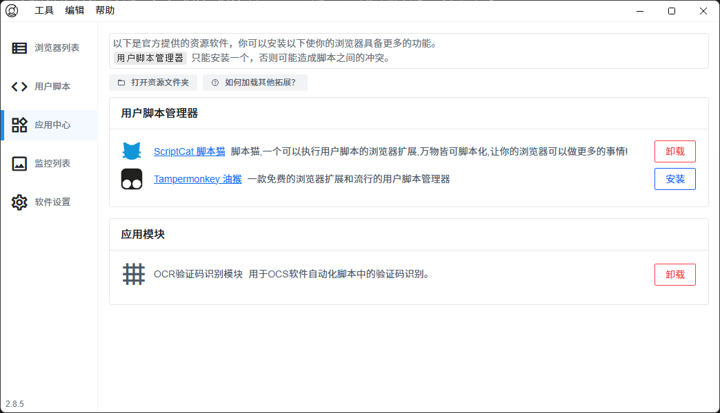 然后在应用中心安装一下脚本管理器以及 OCR 模块
