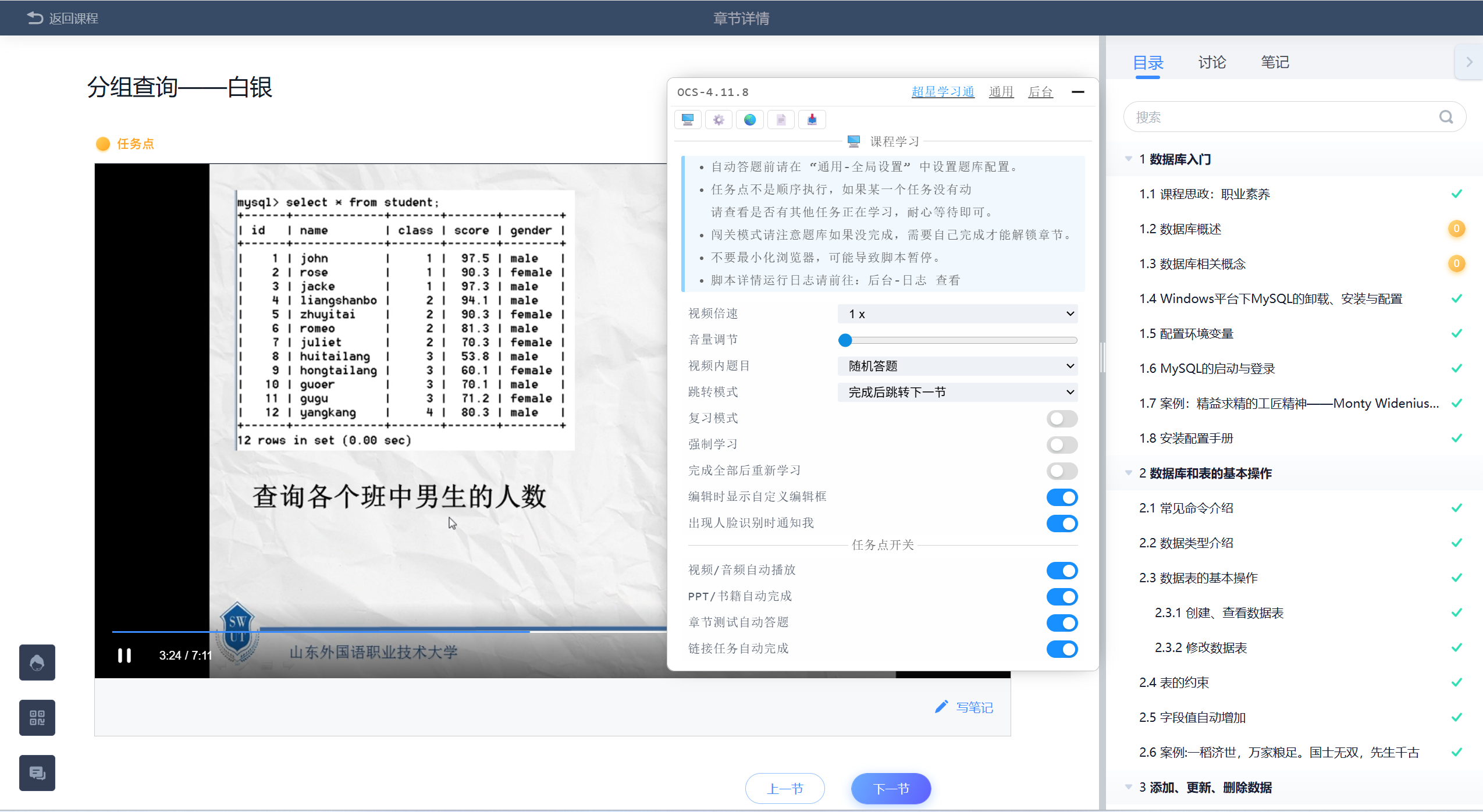 接下来就可以开始愉快的刷课之旅了,除学习通外还支持如智慧树等其他平台,在此不一一演示了,大家有需要自行研究