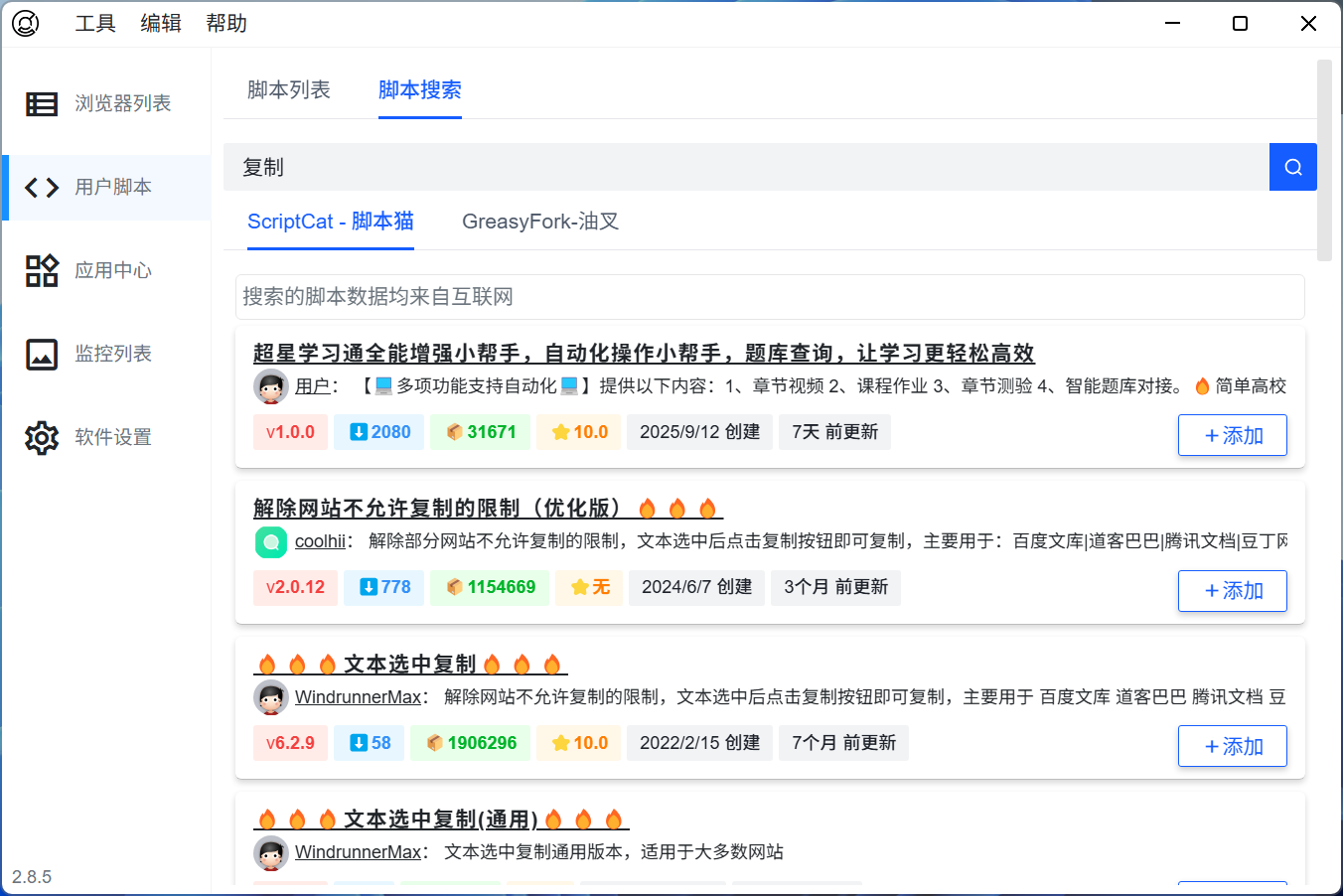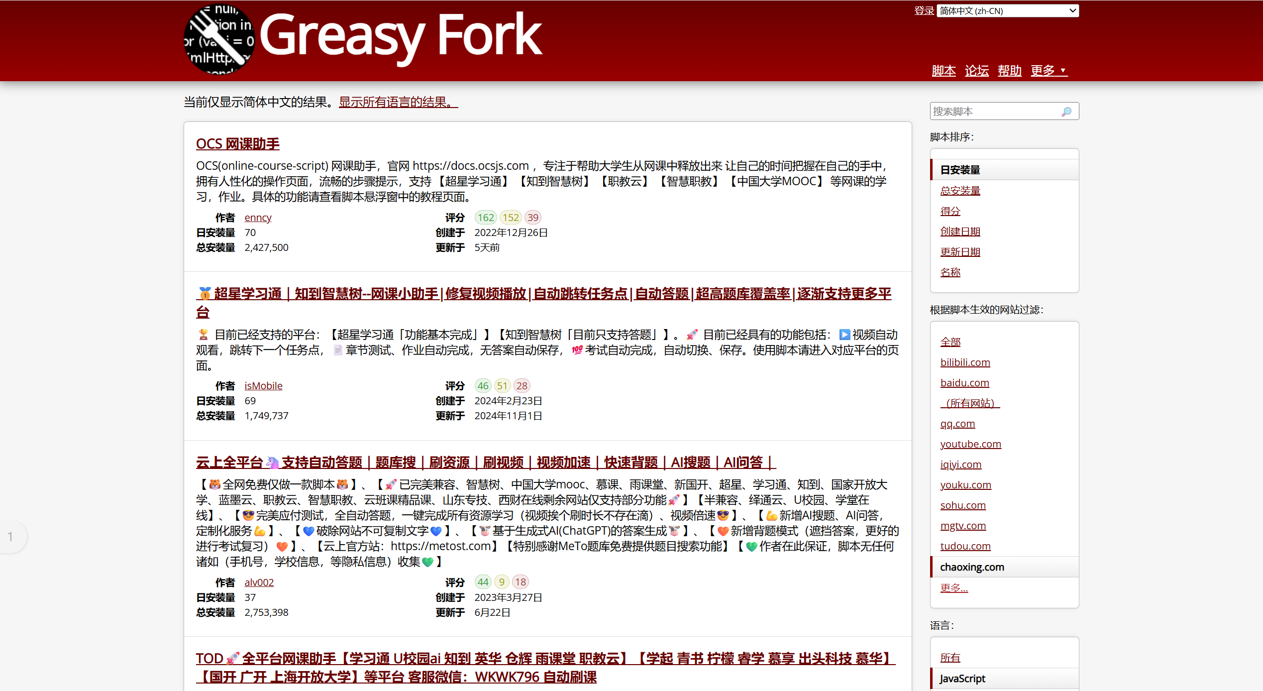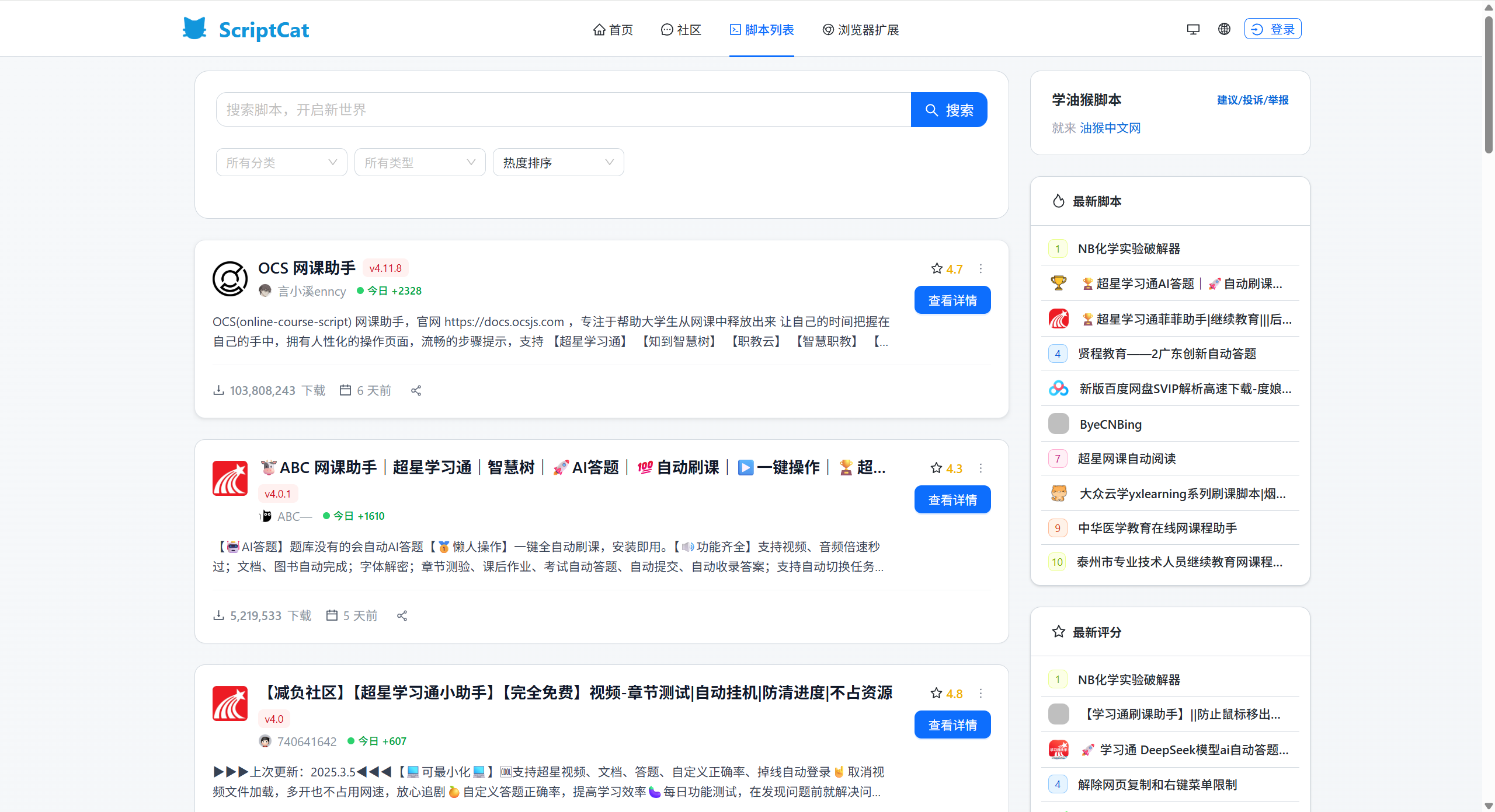 特别是在课程平台如学习通,更新后旧脚本失效后,可以前往脚本站搜索相关脚本,并按照更新时间排序,大概率是能找到最新可用的脚本的