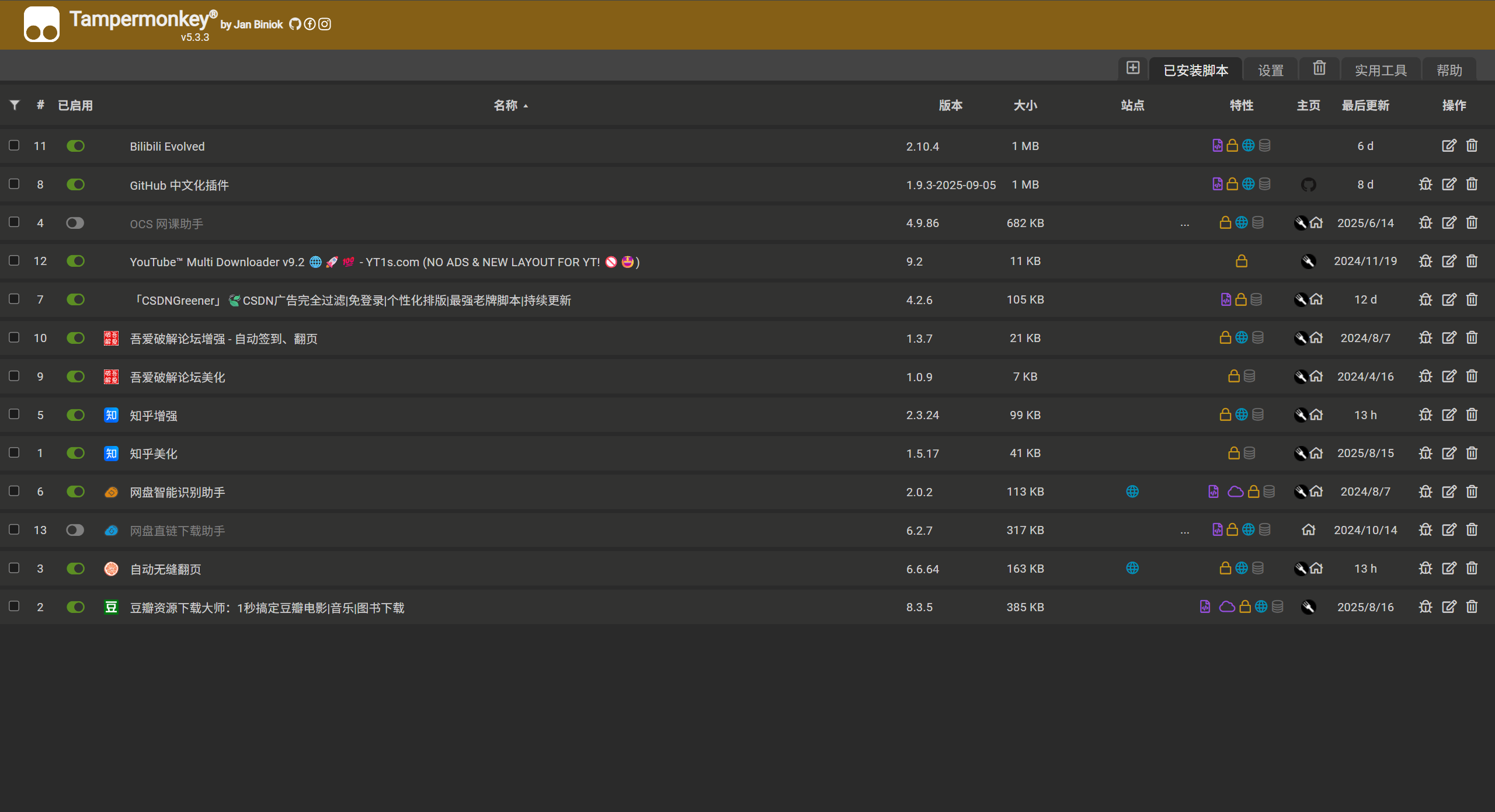 脚本名称左侧的开关可以禁用或启用脚本